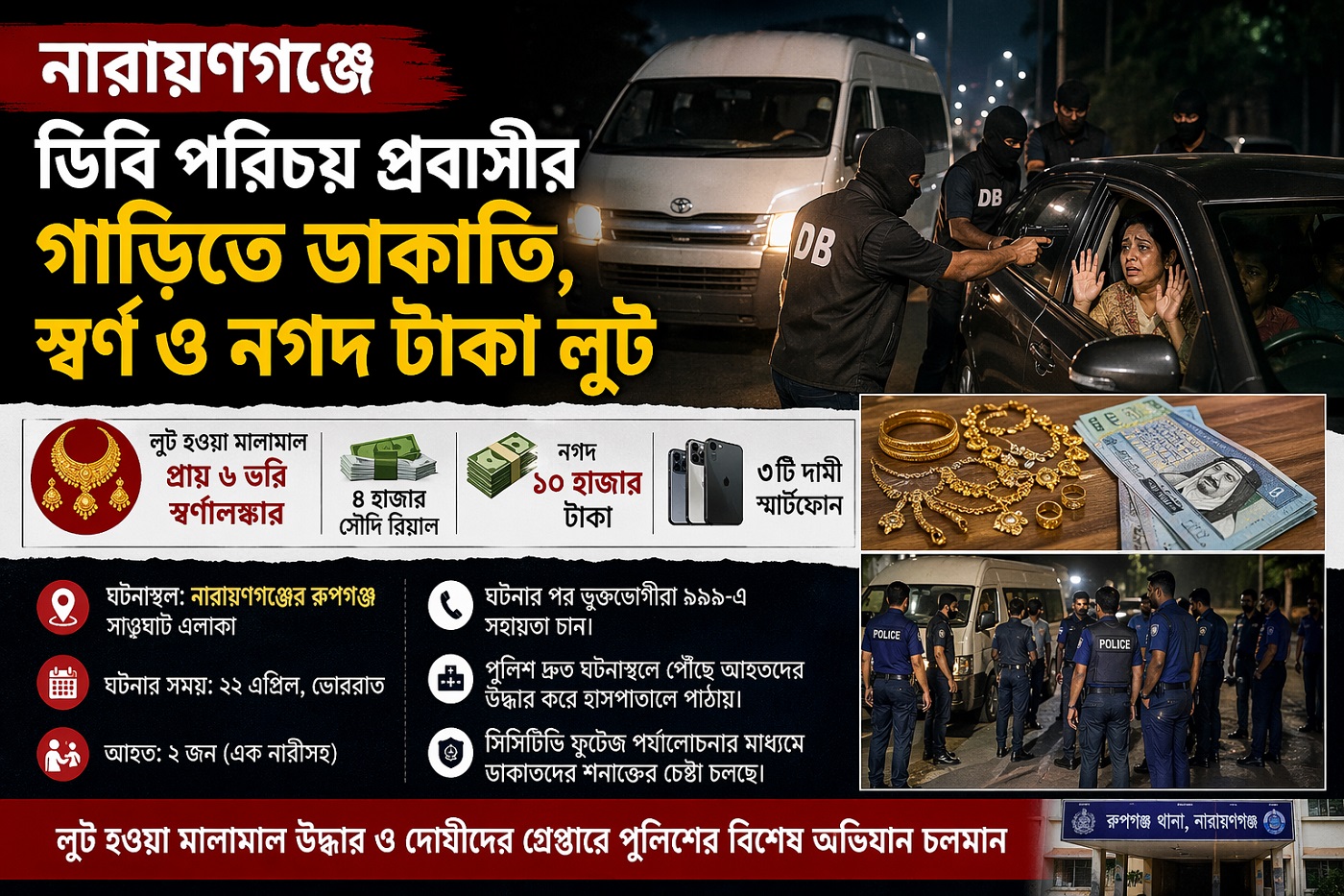 নারায়ণগঞ্জের রূপগঞ্জে ডিবি পুলিশ পরিচয়ে এক প্রবাস ফেরত নারীর গাড়িতে দুর্ধর্ষ ডাকাতির ঘটনা ঘটেছে। ঢাকা-সিলেট মহাসড়কের সাওঘাট এলাকায় অস্ত্রের মুখে জিম্মি করে ওই প্রবাসীর কাছ থেকে কয়েক লাখ টাকার স্বর্ণালঙ্কার, বৈদেশিক মুদ্রা ও মোবাইল ছিনিয়ে নিয়েছে ডাকাত দল। এসময় বাধা দিতে গিয়ে ডাকাতদের হামলায় এক নারীসহ দুইজন আহত হয়েছেন।
